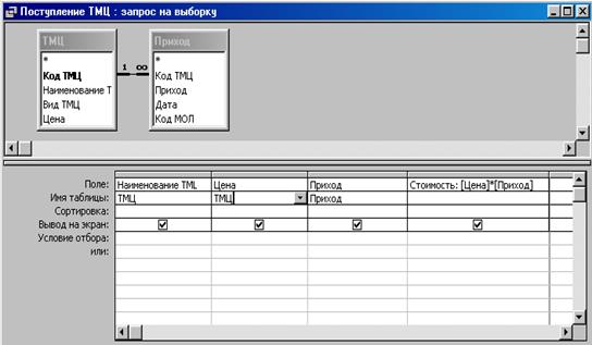 При создании запроса используются две таблицы «ТМЦ» и «Приход». Выбраны поля Наименование ТМЦ, Цена таблицы «ТМЦ» и поле Приход таблицы «Приход». Задано вычисляемое поле Стоимость:[Цена]*[Приход].
