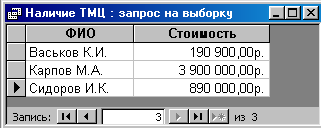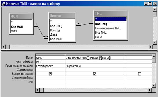 При создании запроса используются три таблицы «МОЛ», «Приход» и «ТМЦ». Выбрано поле ФИО таблицы «МОЛ» и задано вычисляемое поле Стоимость:[Цена]*[Приход]. Применена групповая операция, для поля Стоимость в строке Групповая операция бланка Конструктора запросов задана функция Sum(), для поля ФИО - Группировка.