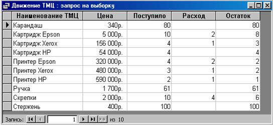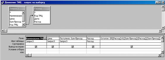 При создании запроса Движение ТМЦ используется таблица «Расход» и созданный запрос, из которого выбираем поля, Наименование ТМЦ, Цена и поле Приход. Из таблицы «Расход» выбрано поле Расход. Создано вычисляемое поле Остаток: IIf([Расход]>0; [Sum-Приход]-[Расход]; [Sum-Приход]).