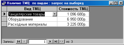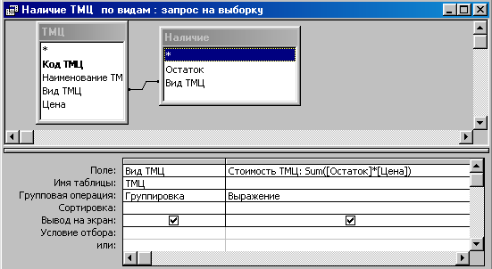 Запрос «Наличие ТМЦ по видам» в режиме Конструктора запросов