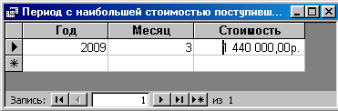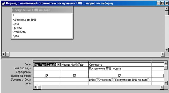 Запрос «Период с наибольшей стоимостью поступивших ТМЦ» обращен к запросу «Поступление ТМЦ по дате». При его создании используются функции Year(), Month(). В строке Условие отбора для поля Стоимость задано - DMax("[Стоимость]";"Поступление ТМЦ по дате").