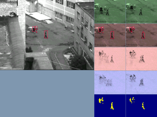 Система, реализованная на базе персонального компьютера, осуществляет ввод с видеокамеры, визуализацию и обработку цифровых изображений движущихся сцен в реальном времени. Система производит оценку и компенсацию общего сдвига изображения сцены, происходящего за счет собственного относительного движения приемника изображения, а также выделение движущихся малоразмерных объектов по признаку их движения и одновременное сопровождение движения нескольких обнаруженных объектов. На рис.6 показаны: слева – кадр видеопоследовательности с выделенными движущимися объектами; справа – стадии выделения движущихся объектов.