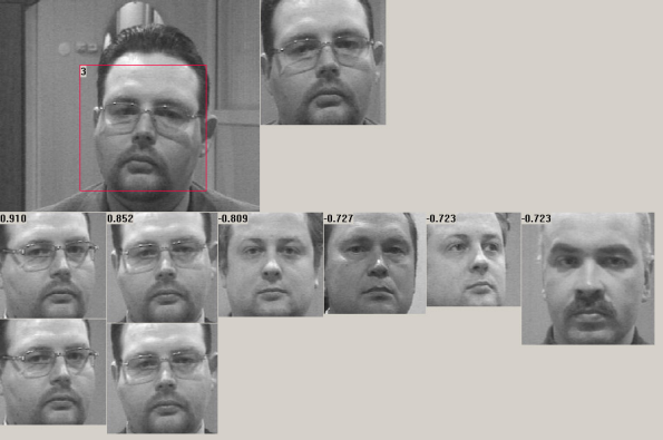 Показаны: текущее видеоизображение (слева вверху), результат выделения лица (справа вверху); результат поиска в индексированной базе изображений лиц (второй ряд изображений – найденные «кандидаты», среди которых могут быть и ложные); результат окончательной идентификации лица (третий ряд изображений – показаны только «кандидаты», успешно прошедшие идентификацию).