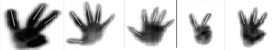 В качестве простого примера можно рассмотреть систему распознавания жестов руки человека по изображениям от черно-белой видеокамеры низкого разрешения (рис.8). Система не требует предварительного обучения и устойчиво различает до 10 различных жестов