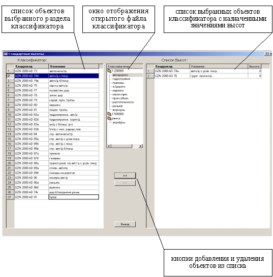 - создание, редактирование и сохранение списка стандартных высот для объектов цифровой карты местности (по видам объектов, согласно классификатора условных знаков);