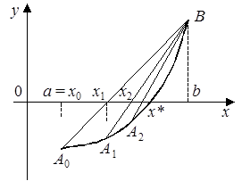 Аналогично для хорды, проходящей через точки A1 и B, вычисляется следующее приближение корня