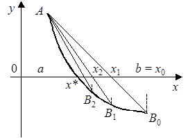 Идея метода хорд состоит в том, что на достаточно малом промежутке [a, b] дугу кривой y = f(x) можно заменить хордой и в качестве приближенного значения корня принять точку пересечения с осью абсцисс. Рассмотрим случай (рис. 1), когда первая и вторая производные имеют одинаковые знаки, т.е. f '(x)f ²(x) >0. Тогда уравнение хорды, проходящей через точки A0 и B, имеет вид