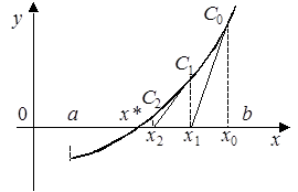 Геометрический смысл метода Ньютона состоит в том, что дуга кривой y = f(x) заменяется касательной. Для этого выбирается некоторое начальное приближение корня x0 на интервале [a, b] и проводится касательная в точке C0(x0, f(x0)) к кривой y = f(x) до пересечения с осью абсцисс (рис. 3). Уравнение касательной в точке C0 имеет вид
