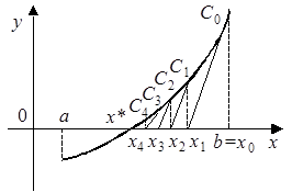 то все приближения к корню x* выполняются со стороны правой границы отрезка [a, b], как это показано на рис. 2, и вычисляются по формуле:
