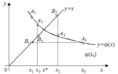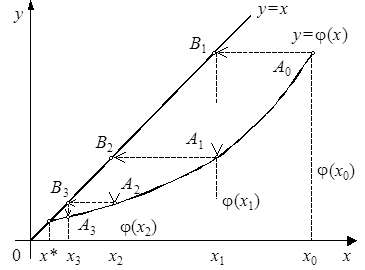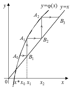 . Следует выбирать такой, который удовлетворяет условию (8), что порождает сходящийся итерационный процесс, как, например, это показано на рис. 5, 6. В противном случае, в частности, при ½j¢(x)½>1, итерационный процесс расходится и не позволяет получить решение (рис. 7).