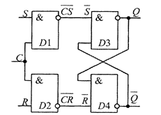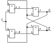 Важливу роль в цифрових пристроях відіграють RS -тригери з синхронізуючими (тактовими) і інформаційними (програмуючими) входами (рис.5). На відміну від асинхронного, даний тригер на кожному інформаційному вході має додаткові схеми співпадіння, перші входи яких об'єднані і на них подаються синхронізуючі сигнали. Другі входи схем співпадіння є інформаційними. Зміна стану тригера можлива лише при наявності одиничного сигналу на синхронізуючому вході С. При нульовому значенні цього сигналу інформація на управляючих входах R і S не сприймається і тригер зберігає свій попередній стан. Таблиця переходів асинхронного тригера (таблиця 3.) співпадає з таблицею переходів синхронного тригера (таблиця 1.) при Сn = 1 -const.