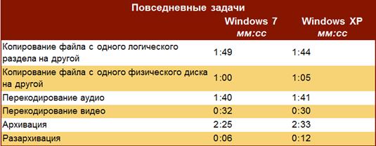 Как можно видеть из таблицы, копирование файлов ожидаемо заняло на обеих системах примерно одинаковое время. Секундная разница в кодировании музыки и двухсекундная при сжатии видео тоже легко укладываются в погрешность измерений. А вот при архивации Windows 7 оказалась на семь секунд быстрее Win XP при сжатии и в целых два раза быстрее при разархивации данных. Но на самом деле объясняется это не разницей в скорости операционок, а разницей в их битности. WinRAR, который мы использовали для этого теста, поддерживает 64-битные вычисления, поэтому на 64-битной Windows 7 он заметно обгонял свою же 32-битную версию.