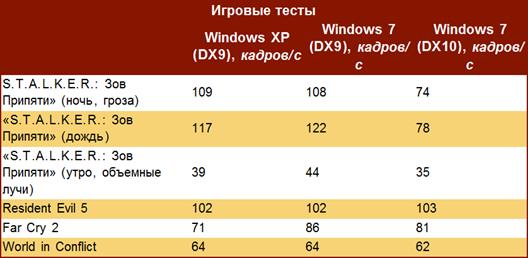 Результаты получились очень интересными: все протестированные игры в DirectX 9 работают на «Семерке» как минимум не хуже, чем на Win XP, хотя мы ожидали небольшого выигрыша старой системы, потому как DirectX 9 для нее — родная платформа. Far Cry 2 под Windows 7 оказался быстрее на целых 15 кадров в секунду. В тесте под DirectX 10 заметно просели «Зов Припяти» и Far Cry 2, в то время как World in Conflict и Resident Evil 5 работали примерно с той же скоростью.