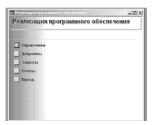 Главная форма «Реализация программного обеспечения» открывается по умолчанию при запуске приложения и включает в себя «Справочники», «Документы», «Запросы», «Отчеты» и «Выход». Элемент «Выход» содержит команду «Выход из приложения» и при его выборе программа закрывается. Форма «Справочники» (рисунок 2) содержит элементы «Программное обеспечение», «Покупатели», «Поставщики», «Производители», «Данные о фирме».