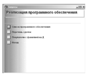 Форма «Запросы» включает элементы «Список программного обеспечения», «Перечень сделок», «Покупатели с фамилией на Д». Вид формы «Запросы» представлен на рисунке 6.