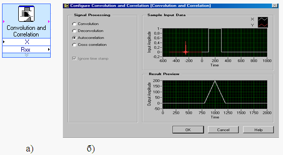 Для измерения корреляционной функции в LabVIEW существует несколько виртуальных приборов. В данной работе используется экспресс-ВП ConvolutionandCorrelation (Свертка и корреляция) (рис. 3 а), так как он представляет собой завершенную программу, не требует никаких дополнительных узлов управления и удобен в использовании. Панель конфигурирования экспресс-ВП ConvolutionandCorrelation показана на рис. 3, б).