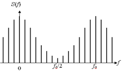 Из приведенного выражения следует, что энергетический спектр случайной последовательности является дискретным и периодическим (рис. 4). Он содержит гармоники частоты f1 = 1/N*Δt. Это самая низкая частота спектра, так как за время, равное длительности случайной последовательности N*Δt, укладывается только один период колебания этой частоты.