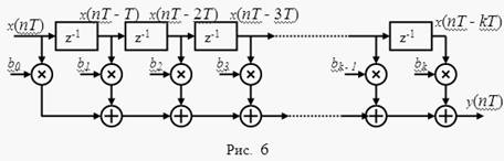 Схема фильтра, построенного по выражению ( 2), приведена на рис. 6. Символ z-1 означает задержку на интервал дискретизации. Фильтр скользящего суммирования (СС-фильтр) является фильтром с конечной импульсной характеристикой (КИХ-фильтром) или нерекурсивным (трансверсальным) фильтром.