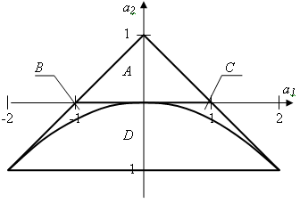 Значения коэффициентов а1 и а2 ограничены областью устойчивости, которая показана на рис. 9 (коэффициенты должны находиться внутри треугольника).Область устойчивости делится на четыре подобласти в зависимости от вида полюсов: А – два действительных полюса разного знака; В – два действительных отрицательных полюса; С – два действительных положительных полюса; D – два комплексно сопряженных полюса. От расположения полюсов будет зависеть форма энергетического спектра и корреляционной функции генерируемого случайного процесса.