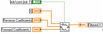Она отличается от записанной ранее системной функции АРСС-фильтра знаком коэффициентов ai (i ≥1).Коэффициенты числителя задаются в виде одномерного массива и подаются на терминал ForwardCoefficients. Массив коэффициентов знаменателя подается на терминал ReverseCoefficients.