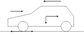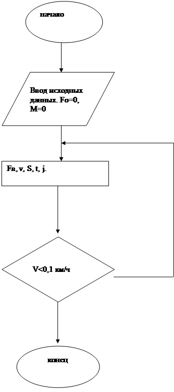 Автомобиль находится в непрерывном движении с момента его трогания с места и до полной остановки. При его движении учитываются следующие факторы: автомобиль движется по горизонтальной дороге с асфальтобетонным покрытием; КПД трансмиссии — 0,85-0,93; коэффициент сопротивления качению f=0,008-0,012; время переключения передач составляет 1 секунду. Автомобиль разгоняется до своей максимальной скорости или до достижения пути 2000 м и переводится в режим выбега. Коэффициент обтекаемости Кb =0,30. На автомобиль непрерывно действуют следующие силы: Fо − полная окружная сила на ведущих колесах при вращении их без буксования, при коэффициенте сцепления шины с дорогой 0,7; Fв — сила лобового сопротивления; G — сила тяжести автомобиля; Ff — сила сопротивления качению; Fj — сила инерции. Также в данной модели учитывается динамический фактор — D.