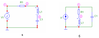 При выполнении моделирования переходных процессов в последовательном колебательном контуре ко входу схемы следует подключить источник импульсного напряжения (V1) с нулевым внутреннем сопротивлением, например PulseSource (рис. 4, а). Тогда при окончании импульсного воздействия (т.е. при V(1) = 0) в RLC-цепи начинаются переходные процессы, зависящие только от величины заряда, накопленного в конденсаторе, и от параметров самой цепи.