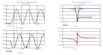 На рис. 5, б изображены АЧХ и ФЧХ последовательного контура (выходное напряжение снимается с узла 2 схемы рис. 4, а). На резонансной частоте (f0