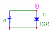 1.1. Собрать схему, показанную на рис.7. Выбрать одну из доступных моделей диодов, например 1S2460. В режиме DCAnalysis задать параметры для первой варьируемой переменной: Method – Auto, Name – V1, Range – 2 (изменение переменной V1 в диапазоне 0…2 В). В качестве независимой переменной указать напряжение на аноде диода V(1), а в окне XExpression задать переменную I(D1). Включите опцию AutoScaleRanges и построить ВАХ. Используя режим электронного курсора (CursorMode), измерить сопротивление диода на линейном участке ВАХ. Для этого расположить левый и правый курсоры на линейном участке полученного графика на некотором расстоянии друг от друга. Параметр Slope (тангенс угла) для переменной I(D1), который в режиме CursorMode находится в нижней части окна графиков, по сути, определяет проводимость диода, а сопротивление – это величина, обратная проводимости.