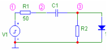 1.3. Собрать схему дифференцирующей RC-цепи (рис. 8), подключив параллельно нагрузочному резистору R2 диод D1, используемый в п. 1.1. Сопротивление R1 = 50 Ом имитирует внутреннее сопротивление генератора V1.