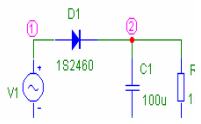 Схема рис. 9 представляет собой простейший однопериодный выпрямитель переменного тока. Резистор R1 служит в качестве нагрузки выпрямителя. Построить графики V(1), V(R1) и I(D1), задав максимальное время моделирования 10 мс. Графики V(1) и V(R1) разместить в одном графическом окне. Используя режим CursorMode и команду TagVertical, измерить величину пульсаций выходного сигнала (ΔU = UМАКС –UМИН ) в конце переходного процесса, выделив курсором соответствующий фрагмент графика (команда Scale).