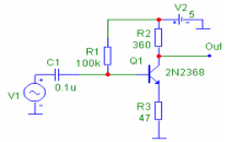 2.2. Собрать схему транзисторного усилителя, показанную на рис. 17. В качестве источника входного сигнала V1 использовать источник SineSource, выбрав модель генератора – «1МГц» и задав амплитуду синусоидального сигнала 0,1 В. Используя режим Transientпостроить графики входного (V(V1)) и выходного (Vc(Q1)) напряжений.