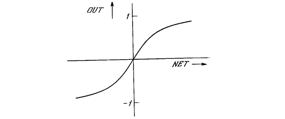 Подобно логистической функции гиперболический тангенс является S-образной функцией, но он симметричен относительно начала координат, и в точке NET = 0 значение выходного сигнала OUT равно нулю (см. рис. 1.4б). В отличие от логистической функции гиперболический тангенс принимает значения различных знаков, что оказывается выгодным для ряда сетей
