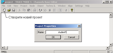 За замовчанням запропоновано ім’я проекту TM50. Утворіть назву проекту з вашого прізвища та поточної дати (наприклад, Petrenko01012009). Задане ім’я відобразиться у вікні заголовку редактора бази каналів.