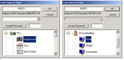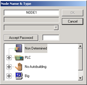 У верхньому текстовому полі цього діалогу задаємо ім’я вузла (максимум 20 символів без пробілів). Нижнє вікно діалогу містить перелік типів вузлів. Тип вузла визначає, який монітор буде використано для його запуску, а також механізми автопобудови його бази каналів.