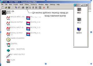 Для кожного вузла проекту створюється база даних реального часу. У Трейс Моуд вона називається базою каналів та має ієрархічну структуру. Канали однієї бази можна об’єднувати в групи за заданими ознаками або довільним чином. Кожна така група називається об’єктом бази каналів . Об’єкти бази каналів можуть підпорядковуватися один одному та утворювати ієрархічну структуру. Отже: