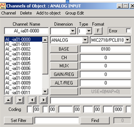 Двічі натисніть ліву кнопку миші на зображенні об’єкта “ ANALOG INPUT ” . Буде викликаний діалог з назвою “ Channels of Object : ANALOG INPUT ” (“Канали об’єкта: ANALOG INPUT ” ). У цьому діалозі виконайте команду Channel => Create (Канал = > Створити ). До списку каналів буде доданий новий канал. Ім’я вибраного зі списку каналу можна редагувати у полі “ Channel : Name ” (“ Канал: Ім’я ” ). Змініть задане за замовчанням ім.’я каналу на ім’я “ai_01”. Виберіть його у списку і виконайте команду Channel => Create by (Канал = > Створити за взірцем ). Змініть ім’я новоствореного каналу на “ai_02”. Закрийте діалог “ Channels of Object : ANALOG INPUT ” , натиснувши стандартну піктограму закриття вікна у полі заголовку діалогу. У робочій області вікна редактора бази каналів справа від назви об’єкта “ANALOGINPUT” відобразиться у кутових дужках число 2 – кількість каналів у даному об’єкті.