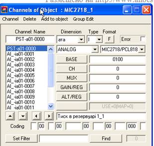 6. Перейдіть до редагування властивостей каналів, двічі клацніть на одному з створених об’єктів бази каналів контролера, наприклад - MIC2718_1. Відкриється вікно редагування каналів об’єкту, як показано на рисунку: