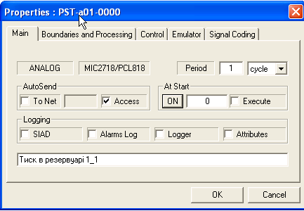 Тепер можна відредагувати властивості каналу. Ми окремо зупинимось на цьому важливому питанні, а зараз нас будуть цікавити тільки ті властивості, котрі нам будуть потрібні для завершення роботи механізму автопобудови зв’язків каналів двох вузлів. Виберіть перший канал і відредагуйте назву каналу, наприклад PST-a01-0000, встановіть для нього розмірність – ата (атмосфера), опишіть канал в полі коментарю, наприклад – Тиск в резервуарі 1_1. Двічі клацніть на вибраному каналі і перейдіть у вікно «Реквізити » вибраного каналу, як показано на рисунку: