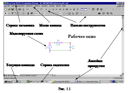 В системе МС8 используется стандартный многооконный графический интерфейс с ниспадающими и разворачивающимися меню. При запуске МС8 появляется основное рабочее окно программы, изображенное на рис. 1.1. На этом же рисунке отмечены некоторые элементы интерфейса.