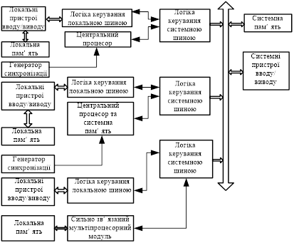 У випадку слабко зв'язаної конфігурації (мал. 2), кожний потенційний ведучий шини працює незалежно й прямі зв'язки між ними відсутні. Між процесорна взаємодія здійснюється через розділені ресурси. Крім того, у кожного модуля може бути своя пам'ять і пристрої вводу-виводу. Процесори в окремих модулях можуть одночасно звертатися до своїх локальних підсистем по локальних шинах і виконувати незалежно друг від друга вибірки команд і даних, що підвищує ступінь паралельності обробки.