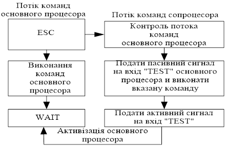 При виконанні потоку команд основного процесора та виявленні команди, призначеної для співпроцесора, вона транслюється асемблером у такий спосіб ─ код команди WAIT, код команди ESC.