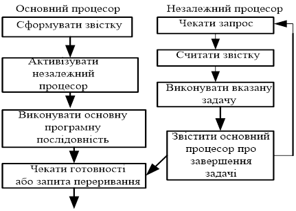 Основний принцип взаємодії полягає у тому, що центральний процесор формує керуюче повідомлення в розділеній пам'яті й активізує незалежний процесор, посилаючи наказ в один з його портів. Потім незалежний процесор звертається до розділеної пам'яті, одержує відтіля призначену йому завдання й виконує її паралельно із центральним процесором. Формат повідомлення про завершення завдання звичайно обумовлений видом (архітектурою й призначенням ) незалежного процесора.