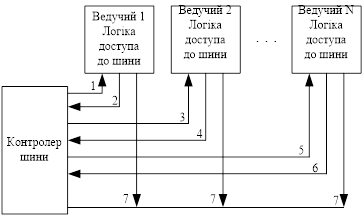 Пріоритети враховуються паралельно. Кожний модуль має окрему пару ліній запиту шини (2,4,6) й дозволи шини (1,3,5) й кожній парі призначений свій пріоритет, що перебуває в контролері. Дешифратор пріоритетів вибирає запит з максимальним пріоритетом і повертає відповідний сигнал дозволу шини. Арбітраж реалізується дуже швидко й не залежить від числа модулів у системі. Вада - максимальна швидкодія. Недолік - велика кількість ліній запиту та дозволу шини ( для n модулів необхідно 2n ліній).