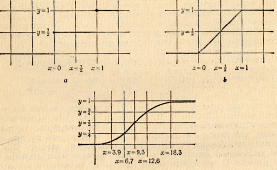 На рис. 1 представлены три примера. Первый, – функция распределения случайного бита, т. е. случайной величины ξ, принимающей значения 0 или 1, каждое с вероятностью 12. На 1, b – функция распределения вещественной случайной величины, равномерно распределенной между нулем и единицей, так что вероятность того, что ξ≤x, просто равна x, если 0≤x≤1. Рисунок 1, c показывает предельное распределение значений V в критерии χ2 . Заметим, что F(x) всегда возрастает от 0 до 1 при увеличении x от -∞ до +∞.