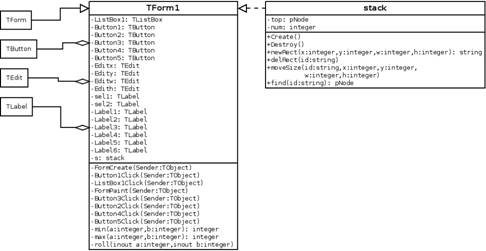 Программа содержит в себе два основных класса: stack и TForm1. stack является классом стека прямоугольников. Все прямоугольники хранятся в нём и вызываются по псевдонимам. TForm1 – класс главного окна программы.