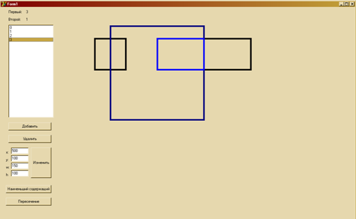 Цель работы, разработка класса прямоугольников со сторонами паралельными осям координат, успешно выполнена. Программа выполнена в среде разработки Delphi и предназначается для работы под управлением операционной системы Windows. Программа позволяет выполнять перемещение, добавление, удаление и изменение размера прямоугольников, а так же позволяет построить минимальный прямоугольник вмещающего в себя два заданных, и построение прямоугольника являющегося общей частью двух выбранных.