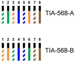 Легко заметить, что, по сути, эти способы отличаются только тем, что зеленая и оранжевая пары в штекере меняются местами. Те жилы кабеля, что в варианте А, шли на ножки 1 и 2 - в варианте B оказываются на ножках 3 и 6, и наоборот. Разводка же кабеля по ножкам 4, 5, 7 и 8 (синяя и коричневая пары) одинакова в обоих вариантах.