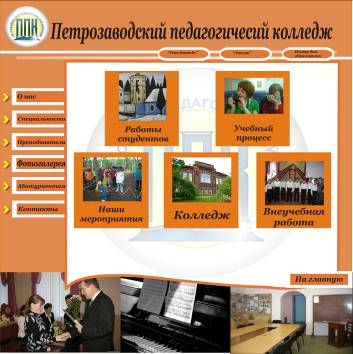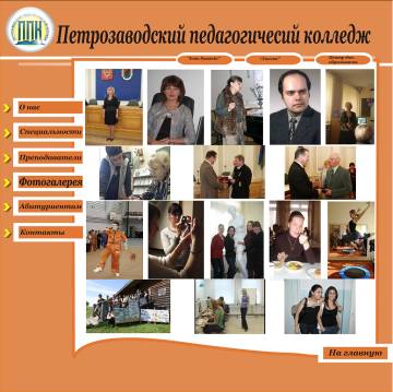 На Главной странице электронной визитки ГОУ «Петрозаводский педагогический колледж» находится шесть фотографий студентов различных отделений и фотография одного из зданий ГОУ «Петрозаводский педагогический колледж».