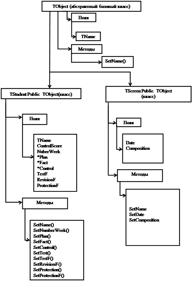 В классе TStudent содержится информация о студенте, выполняющем курсовую работу, точнее о ходе ее выполнения. Также как класс TScreen класс TStudent имеет наследуемое поле TName от класса TObject. Этому полю присваивается значение функцией SetName, которая переопределяется в этом же классе. Помимо этого наследуемого поля, класс содержит собственные поля: