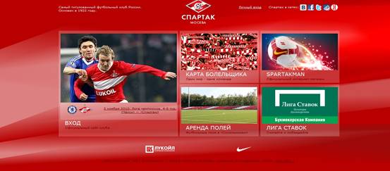 Официальный сайт футбольного клуба «Спартак» Москва выполнен в цветовой гамме «красно-белых». Он отражает упорство команды, решительный настрой на победу, агрессивность в технико-тактических манёврах команды, сочетающихся с благородством, честью и легкостью самого титулованного клуба страны. [3]